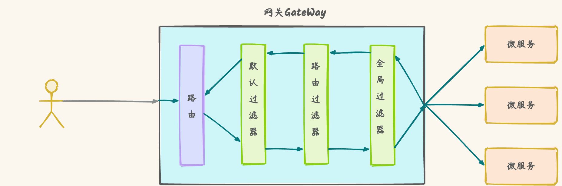 Section titled “5. 过滤器的执行顺序”请求进入网关时会遇到三类过滤器:路由过滤器、默认过滤器(DefaultFilter)和 全局过滤器(GlobalFilter)。在请求路由之后,会将当前路由过滤器、默认过滤器和全局过滤器合并到一个过滤器链(集合)中,排序后依次执行每个过滤器。